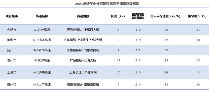 返程中,预计6月14日全国高速返程较易拥堵的路段包括G3京台高速合肥段、 G15沈海高速南通段及S49新扬高速扬州段。端午期间全国高速的交通压力会低于清明、五一假期。