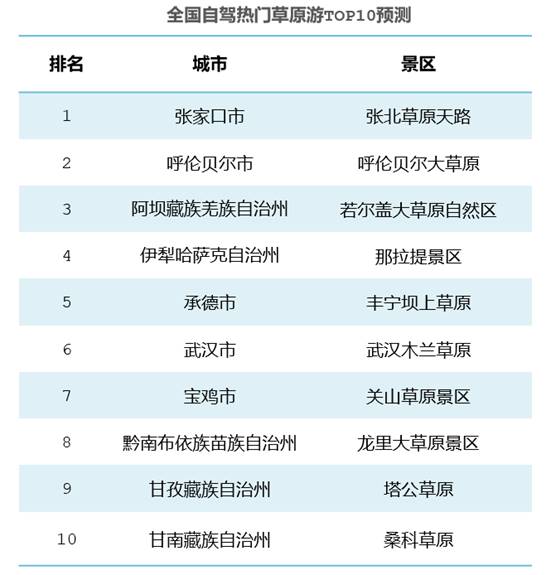 热门草原游中张家口市的张北草原天路最为热门,其次是呼伦贝尔的呼伦贝尔大草原和阿坝藏族羌族自治州的若尔盖大草原自然区。