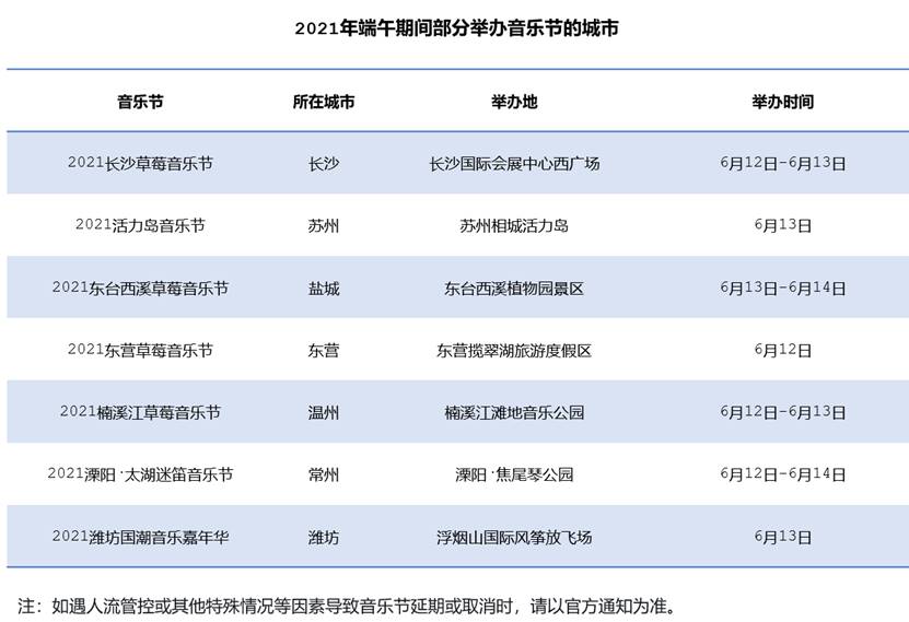 除了游乐园场、草原游,各地日渐兴起的音乐节也成为燃起年轻人出游意愿的新亮点。2021年端午期间,长沙、苏州、盐城等城市音乐节轮番登场,预计节日期间音乐节举办地附近会有短时拥堵或缓行。