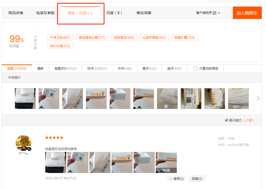 以苏宁宜品卖得最火的抽纸为例,截至6月7日,苏宁宜品抽纸已在网上收到23万条评价,好评率高达99%。“不错”“四层抽纸”“物超所值”是评价中出现频次最多的词汇。