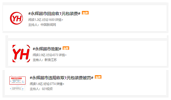 近日,#永辉超市违规收取1元包装费被罚#、#永辉超市回应收1元包装费#等多个话题登上微博热搜。值得注意的是,永辉超市在收取包装费前并未取得消费者同意。