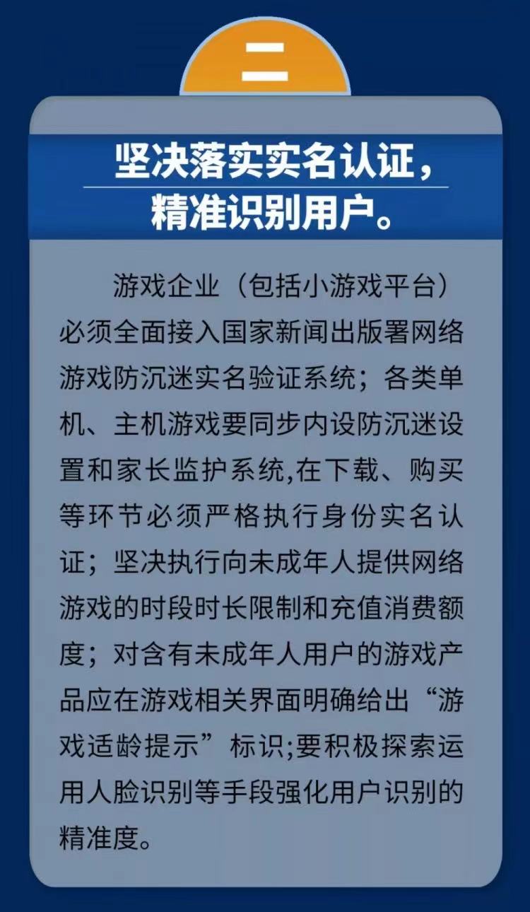 2、坚决落实实名认证,精准识别用户。游戏企业(包括小游戏平台)必须全面接入国家新闻出版署网络游戏防沉迷实名验证系统;各类单机、主机游戏要同步内设防沉迷设置和家长监护系统,在下载、购买等环节必须严格执行身份实名认证;坚决执行向未成年人提供网络游戏的时段时长限制和充值消费额度;对含有未成年人用户的游戏产品应在游戏相关界面明确给出“游戏适龄提示”标识;要积极探索运用人脸识别等手段强化用户识别的精准度。