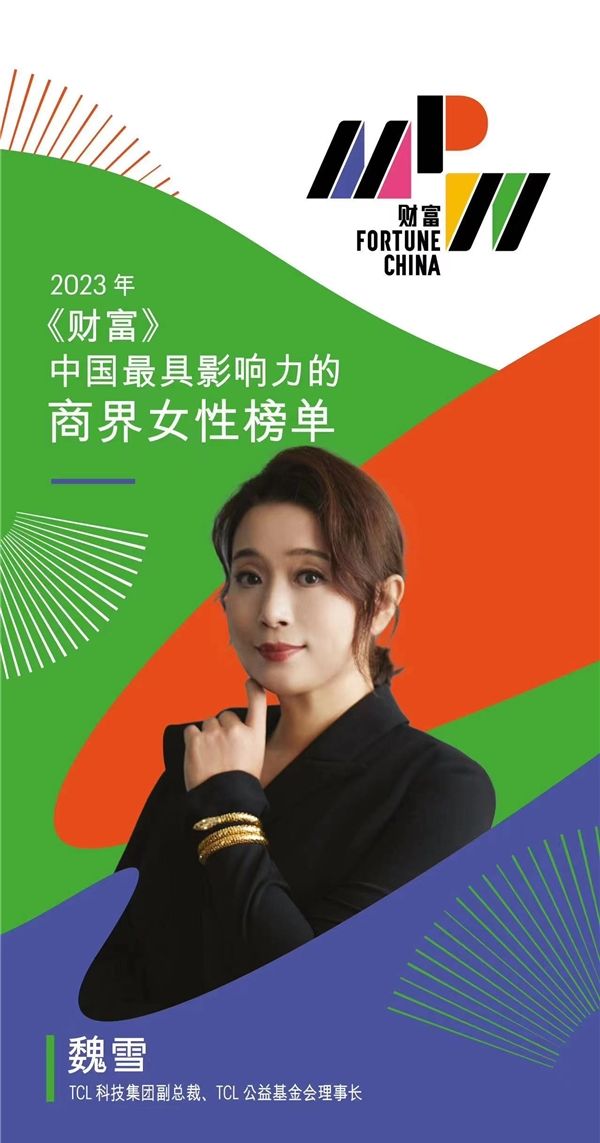 10月25日,《财富》发布2023年“中国最具影响力的商界女性”榜单。TCL科技集团副总裁、TCL公益基金会理事长魏雪凭借在商业管理、企业品牌建设、企业社会责任及可持续发展体系建设等领域的成就入选榜单。